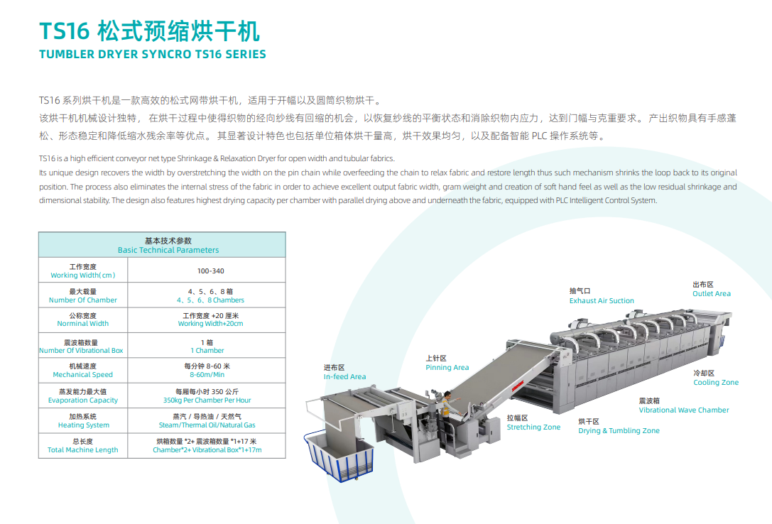 產(chǎn)品簡(jiǎn)介:TS16plus的機(jī)械設(shè)計(jì)獨(dú)特,在烘干過(guò)程中使織物的經(jīng)向紗線有回縮的機(jī)會(huì),恢復(fù)紗線的平衡狀態(tài),消除織物內(nèi)應(yīng)力,達(dá)到門幅、克重要求,織物具有手感蓬松、形態(tài)穩(wěn)定和降低縮水殘余率等優(yōu)點(diǎn)。